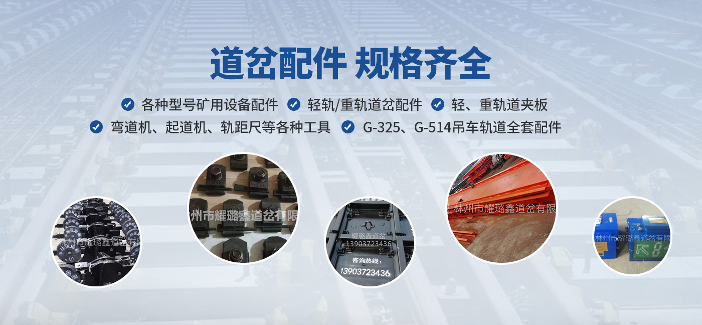 林州市耀璐鑫道岔有限公司位于風景秀麗的太行山紅旗渠畔,東臨京廣鐵路、京珠高速,交通便捷、通訊方便。我公司加工各類國家標準鐵路配件,檢測手段齊全,擁有高科技理化檢驗設備、溫控設備,達到產品質量檢測要求。我公司主要加工經營以下產品:1、各種型號礦用設備及配件;2、各種型號輕軌道岔、重軌道岔及配件;3、各種型號輕、重軌道夾板;4、輕軌、重軌線路用彎道機、起道機、軌距尺等各種工具;5、G-325、G-514吊車軌道全套配件。耀璐鑫道岔秉承“質量可靠、誠信經營”的經營方針,以“優質服務、滿足顧客要求”為已任,嚴把質量關,道岔產品和鐵路配件遠銷各大鋼廠、焦化廠、各大礦務局,受到新老客戶的好評與信賴!您的滿意,我的追求!林州市耀璐鑫道岔有限公司熱忱歡迎各地朋友真誠合作,光臨指導!